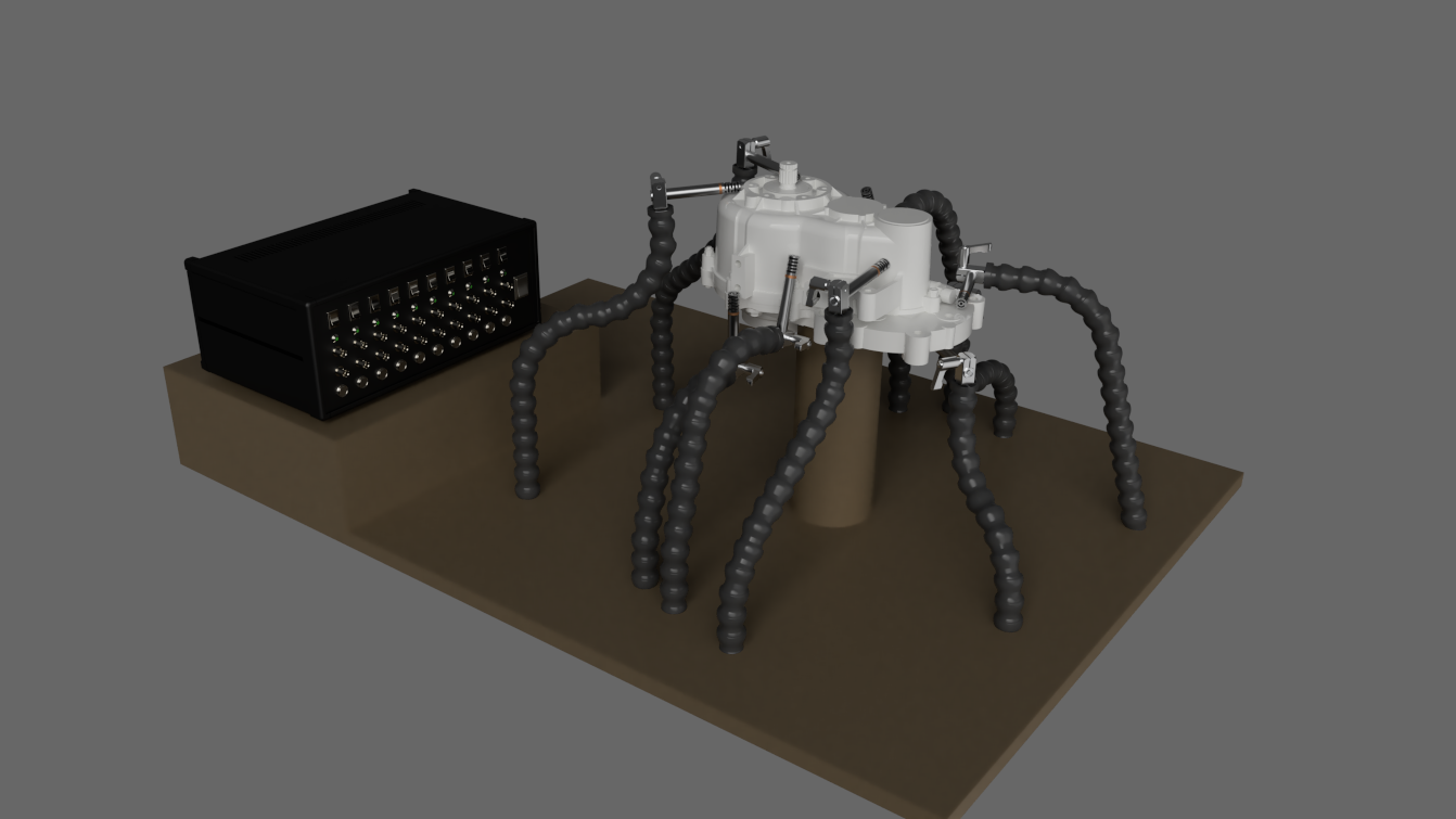 The Weles BOX X was designed for all measurements which require multiple PU probes. Such measurements include the so-called panel noise contribution analysis, operational transfer path analysis or simply sound intensity measurements at fixed probe locations under a variable noise output regime - for example run-up of an electric/internal combustion engine, or order analysis of any type of rotating machinery. The Weles BOX X will also be useful for a custom PU probe array configuration. Example of a PU probe array positioned over a gearbox below: