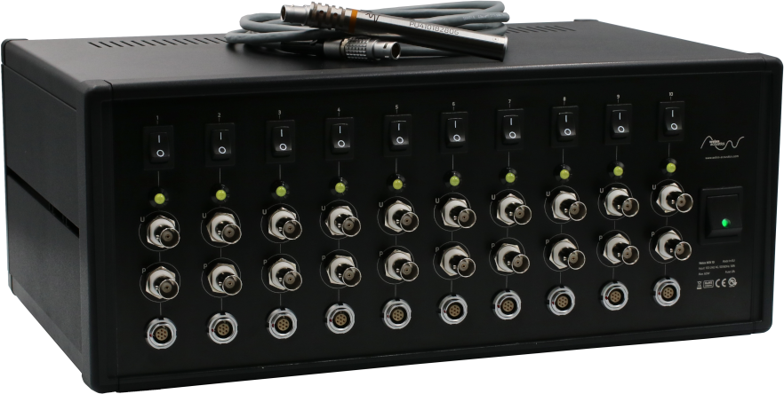 Weles Acoustics' Weles BOX X is a modular device designed to support up to 10 standard WA101 ½” PU Sound Probes. Each probe can be operated separately through a dedicated Weles BOX card equipped with its own individual power switch, probe input port and 2 analog BNC output channels - First channel for sound pressure, second for particle velocity.