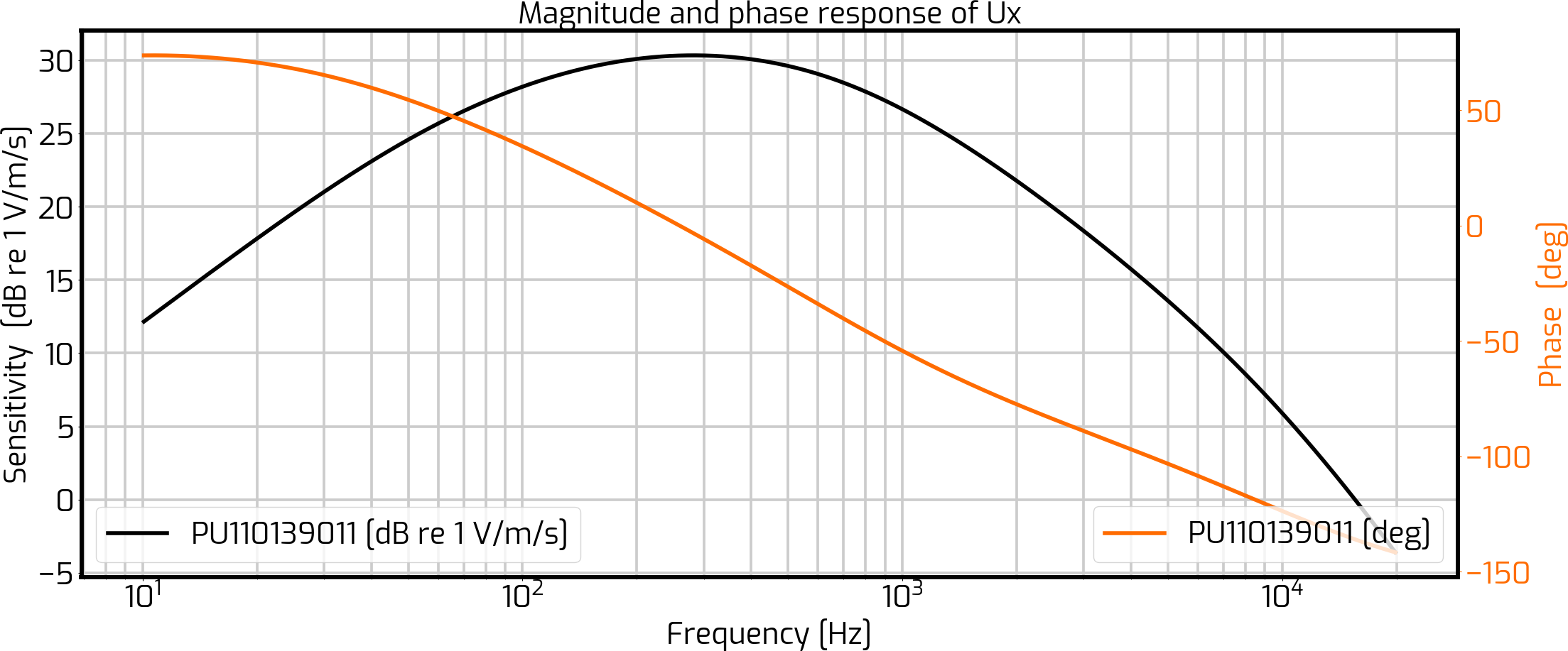 Below an example of a typical frequency response of the Weles particle velocity sensor.