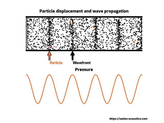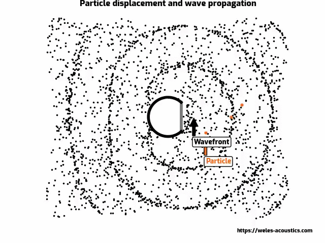 In order to understand how the particle velocity is measured, it is important to grasp the concept of what particle velocity actually is. Let's consider an infinitely long tube with a piston at one end of the tube moving at a fixed audible frequency. In such a scenario, a plane sound pressure wave is formed. The wavefront is traveling along the length of the tube, creating local areas of high and low sound pressure. The behaviour of particle velocity in such a system is best described, if we consider the air inside the tube as a set of singular air particles. As a result of the piston motion, within the tubes volume, there will be local areas of high and low density of air. In other words, the moving piston will cause the air particles to move as well. However, the air particles will not be displaced along the tubes' length. The air particles will oscillate around their respective points of origin. The velocity of this oscillation is known as the particle velocity. The same behaviour of air particles is also observed in free-field conditions. Below an example with a spherical speaker sound radiation: